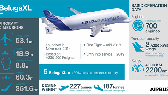 The BelugaXL was launched in November 2014 to address the transport and ramp-up capacity requirements for Airbus beyond 2019. The new oversize air transporters are based on the A330-200 Freighter, with a large re-use of existing components and equipment. The first of five BelugaXLs will fly mid-2018 and enter into service in 2019.